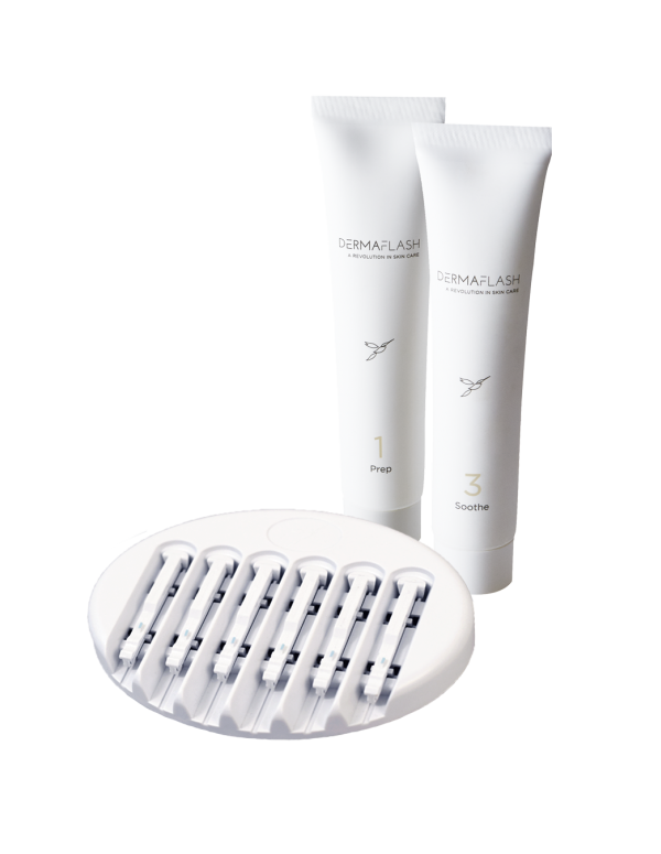 A replenishment kit for use with the DERMAFLASH Facial Exfoliating Device, which unveils smoother, more luminous, and younger-looking skin.